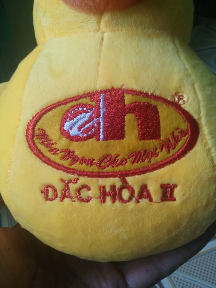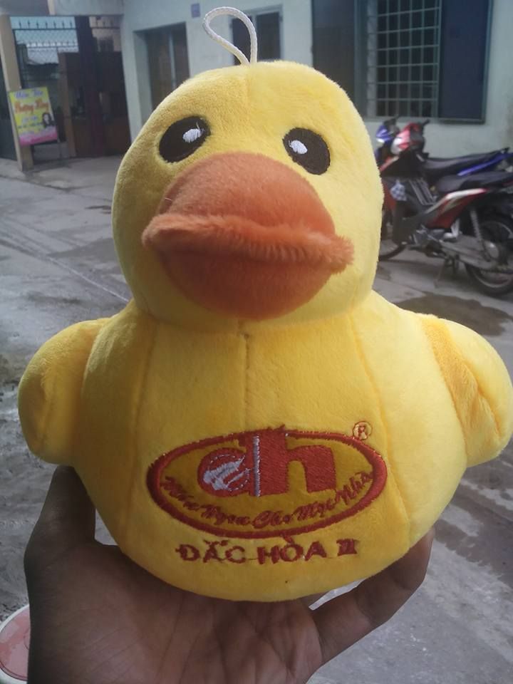 Vịt nhồi bông thêu logo thương hiệu vịt quay Đắc Hòa
